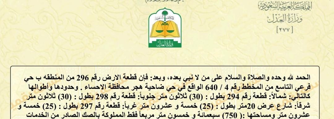 أرض سكنية صك جاهز للبيع المنطقة: الشرقية المحافظة: الأحساء في الضاحية الحي التاسع رقم المخطط: 640/4 حرف ب رقم الأرض 296 المساحة 748 شارع 20 واجهة العقار: شرقية حدود وأطوال العقار: 30*25 مضافة السعر 400,000 ريال المشاهدات 3 تاريخ إنتهاء الإعلان 2025-11-08