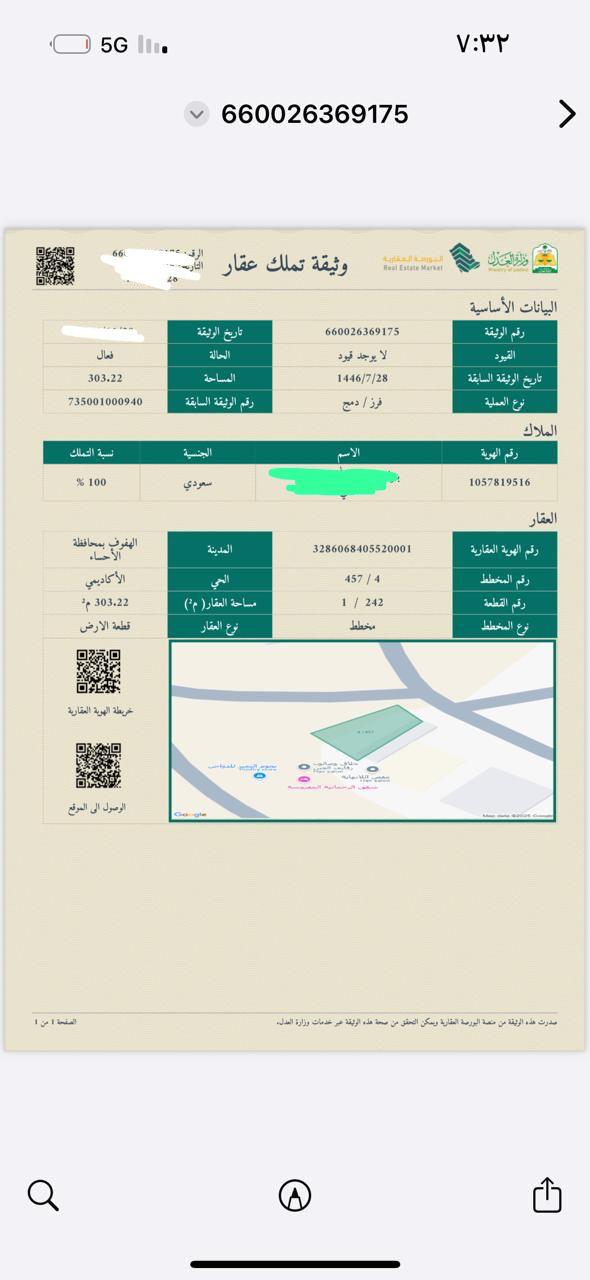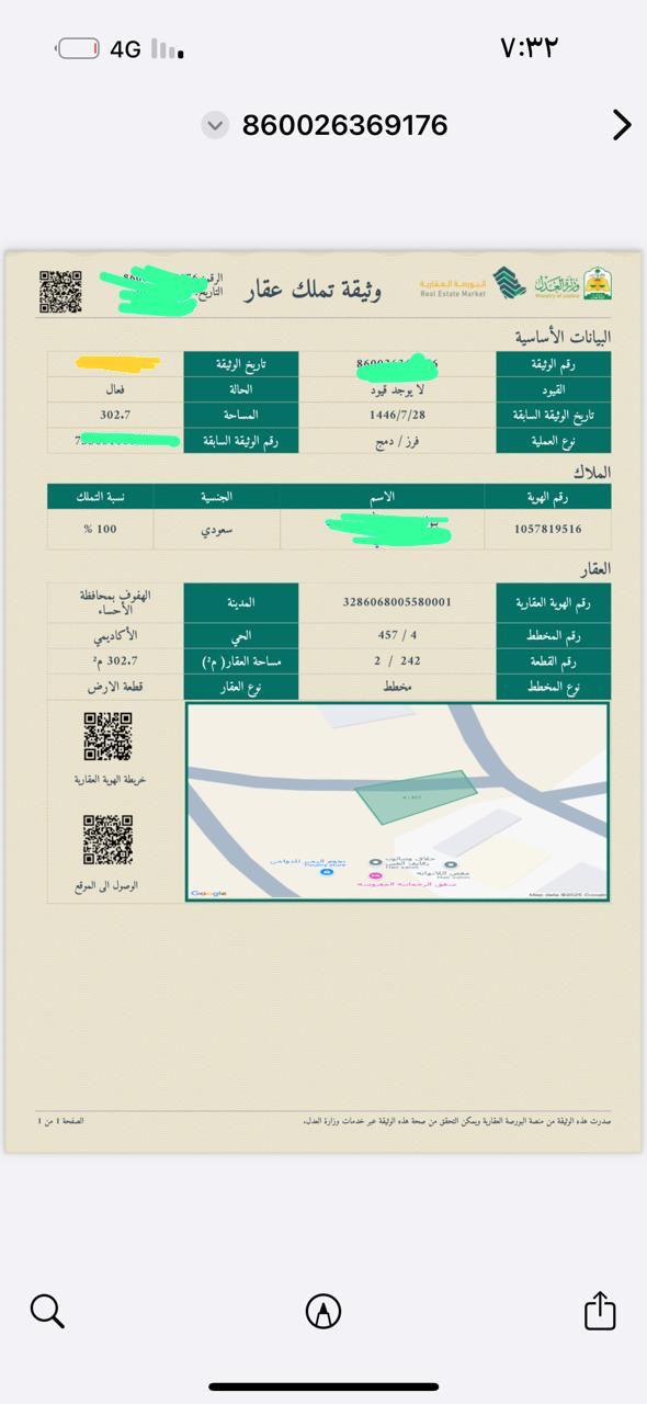 أرض سكنية صك جاهز للبيع المنطقة: الشرقية المحافظة: الأحساء في الرضا رقم المخطط: 457/4 رقم الأرض 242 المساحة 302 شارع 15 واجهة العقار: شرقية حدود وأطوال العقار: 10*31 أرض مفروزة قطعتين مساحة كل قطعة 302م المتر 1,600 ريال المشاهدات 47 تاريخ إنتهاء الإعلان 2025-12-23
